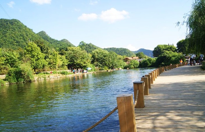 (7)螃蟹井—穆家壩河灘景觀:該景觀以彎曲河道水面為主體,其間具有賓館,螃蟹井、村寨、孤丘組景。該景觀的原始風貌獨具一格,河水碧綠迂回,兩岸秀山并列,山澗螃蟹井水流涓涓,農田稻花滾滾,苗圃翠新,大有“穿花復繞水,隔岸聞花香”風光。版權所有山東聊城聊之旅國際旅行社有限公司,轉載必究!在吉林賓館一帶。更是綠樹成蔭,草坪蔥蔥,姐妹峰則是古藤繞崖,螃蟹井布依農舍更反映了布依山寨特色。