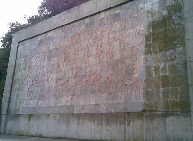 毛澤東填有《憶秦娥•婁山關》詞一首,描寫紅軍指戰員英勇鏖戰的壯烈情景?,F以行草手書體放大鐫于高14米,寬25米的大理石碑上,益增雄關聲色。