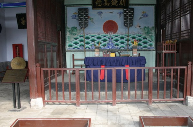 照壁對面的牌坊叫“宣化坊”,它的南面書“菊潭古治”,北面書“宣化”二字,是知縣每月的初一、十五宣講圣諭、教化百姓的地方。大門面闊三間,明間為過道,東梢間的前半間置“喊冤鼓”一架,供百姓擊鼓鳴冤之用;西梢間的前半間立有兩通石碑,上面刻有“誣告加三等,越訴笞五十”,更增加了縣衙的嚴肅性。大門是門子打更報時、監管進出人員的第一道防衛之門。我們進大門后,現在看到東邊的建筑叫寅賓館、衙神廟、三班院,西邊建筑是膳館和國內僅存的清代監獄。從大門到大堂百米甬道的中央有道門,叫儀門,是官府的第二道門。中間的大門過去時常不開,只在新官到任的第一天或迎接州、府官員時才可打開;儀門東西兩邊還各有一個小門,東邊的門叫生門,過去時常開著,供人們的日常出入,西邊的門叫“死門”,又叫鬼門,當犯人被判處死刑之后,從西門拉出去行刑,所以舊時處決犯人叫走西門或上西天。