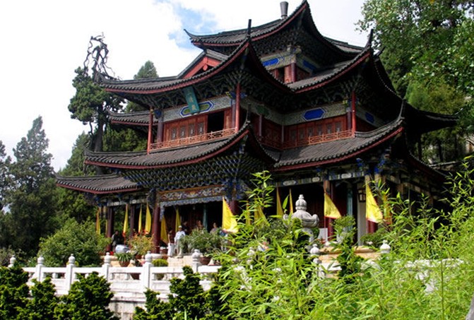 五鳳樓(原名法云間),位于黑龍?zhí)豆珗@北端,始建于明萬歷二十九年(公元1601年),1983年被公布為云南省重點文物保護單位。樓高20米,為層甍三重擔結構,基呈亞字形,樓臺三疊,屋擔八角,三層共24個飛檐,就象五只彩鳳展翅來儀,故名五鳳樓。全樓共有32棵柱子落地,其中四棵中柱各高12米,柱上部分用斗架手法建成,樓尖貼金實頂。天花板上繪有太極圖、飛天神王、龍鳳呈祥等圖案,線條流暢,色彩絢麗,具有漢、藏、納西等民族的建筑藝術風格,是中國古代建筑中稀世珍寶和典型范例。