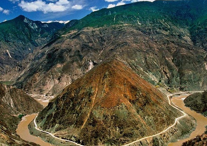 金沙江由北東去,匯集雅壟江、大渡河、嘉陵江,于是中國(guó)便有了長(zhǎng)江。瀾滄江由北南下緩緩而流,穿越國(guó)界便成了鄰國(guó)湄公河的上游。怒江山北南下奔騰急湍闖進(jìn)緬甸便成了薩爾溫江的上游。三江同發(fā)源于青藏高原,三江攜手并肩在云南崇山峻嶺中奔流。而金沙江經(jīng)石鼓鎮(zhèn)天造奇觀(長(zhǎng)江第一灣)急轉(zhuǎn)回頭大江東去最終流入太平洋……而瀾滄江、怒江穿流緬甸、越南、老撾、泰國(guó)最終流入印度洋……