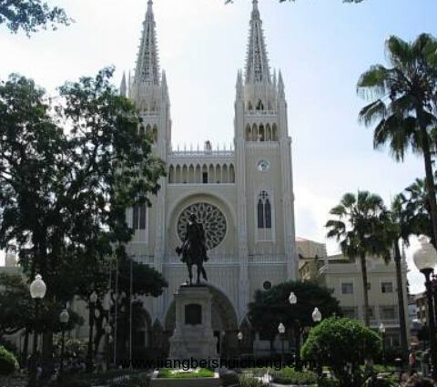 瓜亞基爾城中心是一百年廣場,廣場上高聳著1920年修建的巨大的解放紀念碑。著名的弗朗西斯科大教堂在廣場不遠的地方,這座建筑氣勢宏偉,裝飾華麗,是瓜亞基爾的建筑珍品。教堂前面有一座風景優美的公園,在公園樹林深處可觀賞到各種珍貴動物。瓜亞基爾最繁榮的街道是10月9日大道,路旁商店比鱗而立,人群擁擠。大道穿過一百年廣場,通向馬萊孔濱水區,濱水區沿瓜亞斯河岸鋪開。壯觀典雅的市政廳和政府官就坐落在這一帶。漫步街頭,可看到南美獨立運動的領袖玻利瓦爾和圣馬丁的塑像。1822年7月26日—27日,這兩位民族英雄就在此共商大計,決心把西班牙殖民者全部趕出拉美大陸并爭取南美各國的徹底獨立。這次歷史性的會晤為南美人民贏得了偉大的勝利。