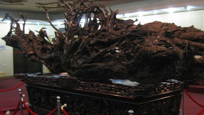 《中華根展覽》是由千年古樟巨根雕制而成。它長6.30米,高2.30米,其狀屈曲崢嶸,其勢鳳翥龍?bào)矗菫?ldquo;養(yǎng)在深閨人未知”之珍寶。它鐫刻著女媧補(bǔ)天、夸父追日、大禹治水、赤壁賦等遠(yuǎn)古傳說,歷代史事,英烈忠魂,前修偉業(yè),煌煌五千年文明史,盡覽于一根。洋洋灑灑百余構(gòu)圖,故事經(jīng)典,場面恢宏,造型傳神,栩栩如生,嘆為觀止。四周星羅姿態(tài)各異精品根藝80余類,根造型、根拼字、根貼畫、根包石、竹蔸雕……品類繁多,琳瑯滿目。每件根藝標(biāo)示牌均配以詩文,新穎別致,內(nèi)涵博深,耐人品味。觀者感慨:通觀此展,仿若閱讀一部歷史巨著,又似步入大千文學(xué)殿堂,更象闖進(jìn)精美絕倫的藝術(shù)大觀園,不知不覺中,深受傳統(tǒng)美德和民族精神的熏陶。