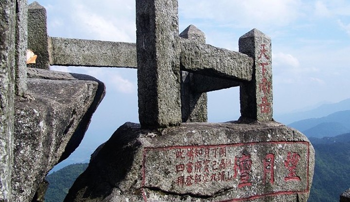 現(xiàn)在山頂?shù)淖H诘钍乔迩∈辏?751年)下詔重建的,石墻鐵瓦。祝融君這位職掌南離的火正宮,經(jīng)過歷代帝王的神化和加官進(jìn)爵,由隋、唐兩代的“司天王”到宋朝的“司天昭圣帝”,制擬帝王,祀以國典。祝融殿自清朝乾隆重修后,因風(fēng)霜蝕剝,民國二十一年,時(shí)任湖南省主席的何鍵又捐資重修。1982年南岳管理局重新翻修,始成為現(xiàn)在的面貌。祝融殿高踞祝融峰頂,構(gòu)筑在一個奇石重壘、風(fēng)急云涌的百多平方米的頂隙里,可以想見當(dāng)年建筑的艱辛。從祝融峰麓的上封寺到峰頂?shù)淖H诘睿谢◢徥穼訉犹萁拥椒屙數(shù)紫拢穬膳裕沙芍瘢交€漫,頗為潔致。從峰頂?shù)啄_通到祝融殿山門前石砌平臺,有三十多級陡峻的花崗石臺階。山門是座牌坊式建筑,牌坊上有“祝融峰”三字石額,卻未額為“祝融殿”。門兩側(cè)有對聯(lián):“寅賓出日,峻極于天。”前者指清晨五到六點(diǎn)時(shí)太陽升起,后者說祝融峰頂比天還高峻。這副對聯(lián)的句子集自《詩經(jīng)》,對仗工穩(wěn),渾然天成,又切合祝融峰頂景物,極具匠心。祝融殿右側(cè)走廊有另一條小門通向望月臺。望月臺比祝融殿正殿基約高2-3米,是花崗巖風(fēng)化后裸露而成。整塊巖面不到4.5平方米,靠邊處圍上石欄,既可臨風(fēng)小坐,也可憑石欄桿眺望。因?yàn)樗亲罡唿c(diǎn),所以空景無際,山風(fēng)襲人,瀟湘帆影,遠(yuǎn)近山巒,盡奔眼底。望月臺石上原有不少石刻,因?yàn)榭淘谂_面石上,版權(quán)所有山東聊城聊之旅國際旅行社有限公司,轉(zhuǎn)載必究!風(fēng)雪侵蝕,游人摩挲、踐踏,許多已漸磨滅。現(xiàn)存的有明朝嘉靖丁巳(1577年)九月寶慶知府書刻“望月壇”三個約50厘米見方的字,鐫刻在巖的內(nèi)壁上,楷書橫排。其余在臺石上與臺內(nèi)外峭壁上的石刻還清晰可辨的有“竣極”、“仰止處”、“果是高”、“青云在望”、“青云滿袖”、“山不厭高”、“覺夢處”、“千維綠”、“天外幽賞”、“壽比南山”、“唯我是高,尊峙寰中”等等,大都不知是何年何代刻品。