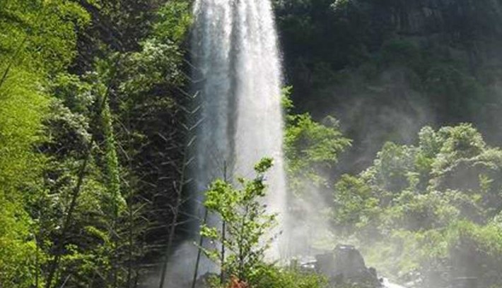 瀑布高200多米,上窄下寬,活似從天邊撒下的一具銀線網。是猛洞河最大的瀑布。它是一條水量豐富的小河,在此處突然失去河床的依托,水流飛奔直下,臨空跌落到底下的陡坡上,然后呈弧行展開,直飛到司河。此瀑布近觀滔滔、涸霧朦朧、凌空習墜、漫天飛珠,奔騰直下。流水傳說,這里原來沒有瀑布,只是一山石壁高聳藍天。壁下只有這具隋園形澄潭。古時候,潭中魚妖成群,作惡多端,其中一黑魚妖,每每掀翻船筏,攬人落水,以供餐食,據說在這里翻船破筏的人落水后沒有一個人能出來。人們苦叫這里為落水坑,年復一年,人們無奈,求上天保佑,于是玉皇派觀音下塵明查,查知黑魚作祟便揮手出線,招手成網,一句咒語,黑魚妖落入網中,為了讓世人咄言黑魚,便將黑魚掛在石壁之上,遺臭萬年。觀音走后,魚網變成了這個大瀑,故名落水坑瀑布。現遠觀瀑布還可看到淹留在瀑內的黑魚,隱隱約約在流水下閃動,那情景象是在緩緩向上游呢。