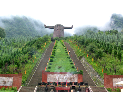 神農架據(jù)傳是華夏始祖、神農炎帝在此搭架采藥、療民疾矢的地方。他在此“架木為梯,以助攀援”,“架木為屋,以避風雨”,最后“架木為壇,跨鶴升天”。神農炎帝是華夏文明開創(chuàng)者之一,后人將其豐功偉績列陳有八:訓牛以耕,焦尾五弦,積麻衣革,陶石木具,首創(chuàng)農耕,搭架采藥,日中為市,穿井灌溉。為緬懷祖先,頌其偉業(yè),林區(qū)人民政府于1997年開始在神農架主峰南麓小當陽興建神農祭壇一座,塑其雕像于群山之中,但見牛首人身的神農氏雙目微閉,似思似眠,神農塑像與千年古樸相擁而立,景致渾宏,氣宇不凡,蔚為壯觀。