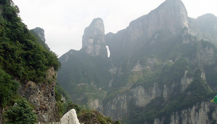 天門山,古稱云夢山、嵩梁山,是張家界永定區海拔最高的山,距城區僅8公里,因自然奇觀天門洞而得名,最早被記入史冊的名山。三國吳永安六年(公元 263 年),嵩梁山忽然峭壁洞開,玄朗如門,形成迄今罕見的世界奇觀――天門洞,從此而得名天門山。山頂相對平坦,保存著完整的原始次生林,有著很多極為珍貴和獨特的植物品種,森林覆蓋率達90%。其間古樹參天,藤蔓纏繞,青苔遍布,石筍、石芽舉步皆是,處處如天成的盆景,被人譽為世界最美的空中花園和天界仙境。2012年7月22日中午,法國輪滑大師讓伊夫•布朗杜挑戰天門山。