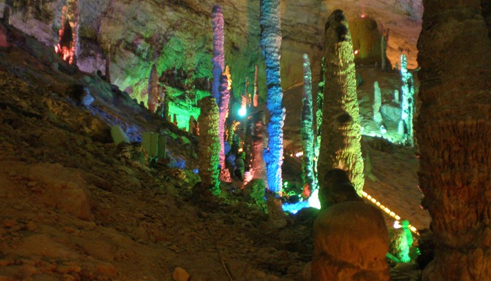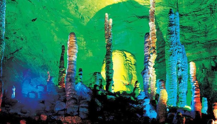 龍宮是黃龍洞十三個(gè)大廳中最大的一個(gè),也是景色最美的景點(diǎn)之一,底面積為15000平方米,平均高40米,兩千余根石筍拔地而起,千姿百態(tài),異彩紛呈,或如飛禽走獸,或如宮廷珍藏,有的像巍巍雪松,有的像火箭升空。