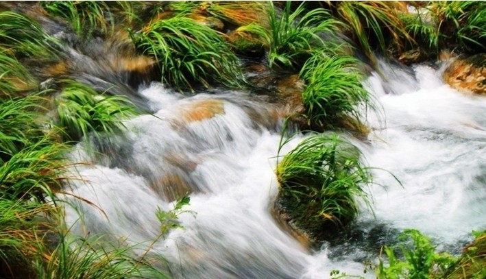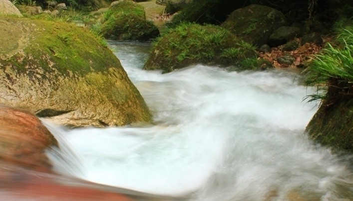 9、紫草潭:位于金鞭溪中游。原名紙草潭,因清代山民造土紙?jiān)诖似鞫L秾?米,長(zhǎng) 15 米,深2米。上連一石潭。潭底皆紫紅色巖石,潭上端溪流湍急,跌宕有聲,水花如滾珠瀉玉。潭內(nèi)水面平靜,清澈見(jiàn)底,魚(yú)蝦悠游其中。 游魚(yú)細(xì)石,直視無(wú)礙,夾岸林林蒼翠,石峰屏列。潭邊巨石橫臥,光潔如玉。