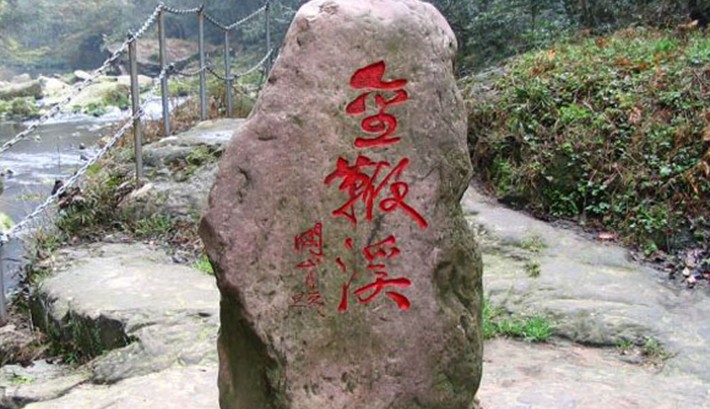 4、醉羅漢:與金鞭巖隔溪對(duì)峙,矗立在斜坡上,高200余米。 上下一般粗壯,峰體渾圓,色赤,整座石峰向金鞭溪呈70度傾斜,形似一醉酒羅漢,欲倒不倒,似醉非醉,詼諧幽默,發(fā)人情趣。自峰下向上仰望,但覺(jué)云移峰晃,感覺(jué)隨時(shí)都要崩塌之感。 清嘉慶年間學(xué)士彭之 臣在峰壁書(shū)寫(xiě)一“忠”字。清道光四年(1824),貢生彭之運(yùn)作《壁忠記》一文以彰其勝。風(fēng)雨滄桑,“忠”字因山石崩塌遭毀。