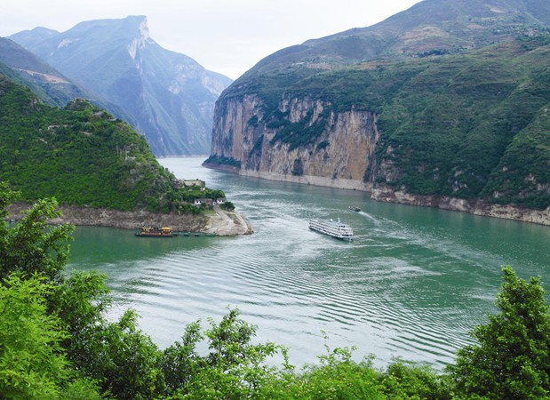 瞿塘峽長(zhǎng)8公里,是三峽中最短的一個(gè)峽。我想它應(yīng)該也是雄偉險(xiǎn)峻的一個(gè)峽。 端入口處,兩岸斷崖壁立,相距不足一百公尺,形如門(mén)戶,名燮門(mén),也稱瞿塘峽關(guān),山巖上有“夔門(mén)天下雄”五個(gè)大字。左邊的名赤甲山,相傳古代巴國(guó)的赤甲將軍曾在此屯營(yíng),尖尖的山嘴活像一個(gè)大蟠桃,右邊的名白鹽山,不論天氣如何,總是迂出一層層或明或暗的銀輝。瞿塘峽雖短,卻能“鎮(zhèn)全川之水,扼巴鄂咽喉”,有“西控巴渝收萬(wàn)壑,東連荊楚壓摹山”的雄偉氣勢(shì)。古人形容瞿塘峽說(shuō),“案與天關(guān)接,舟從地窟行”。