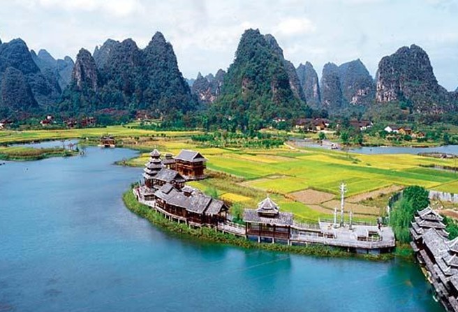 陽(yáng)朔“世外桃源”主要有荷花池、燕子湖、燕子洞、侗鄉(xiāng)風(fēng)情和原始部落組成。若是“沾衣欲濕杏花雨,吹面不寒楊柳風(fēng)”的季節(jié).踏進(jìn)“世外桃源”,展現(xiàn)在眼前的將是一片秀美的山水田園風(fēng)光。清波蕩漾的燕子湖鑲嵌在大片的綠野平疇之中,宛如少女的明眸脈脈含情。湖岸邊垂柳依依,輕拂水面。一架巨大的水轉(zhuǎn)筒車,吱吱呀呀地?fù)u著歲月,也吟唱鄉(xiāng)村古老的歌謠。放眼望去,遠(yuǎn)方群山,村樹(shù)含煙,阡陌縱橫,屋宇錯(cuò)落,宛若陶淵明筆下“芳草鮮美,落英繽紛”“有良田美池桑竹之屬”的桃源畫境。