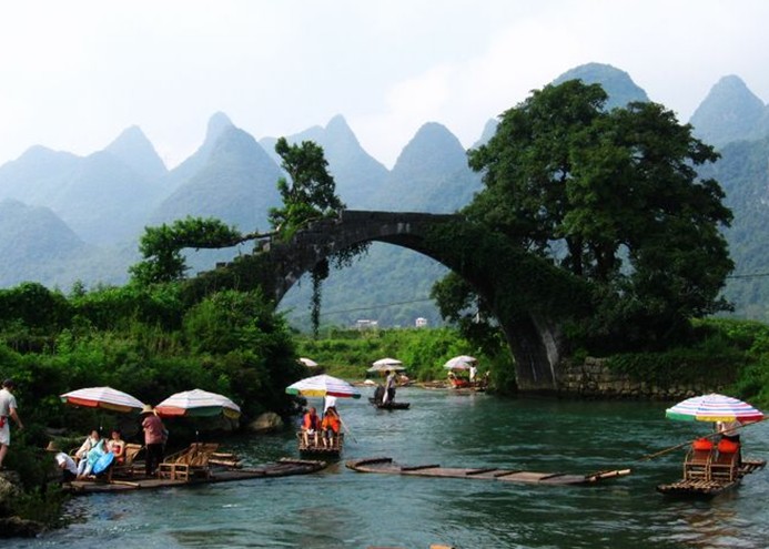 遇龍河是一條美麗的河流,特別是遇龍橋以下,至與金寶河匯合的合山江口。約12干米這一段,群峰疊聳,村莊錯(cuò)落,可以觀賞到遇龍橋、犀牛望月、穿山古寨、歸義城遺址、立指山、雙流渡口、駿馬凌空等風(fēng)光勝跡,是陽朔風(fēng)景又一佳境。
