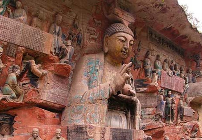 重慶市的大足石刻以其規模宏大、雕刻精美、題材多樣、內涵豐富和保存完整而著稱于世。它集中國佛教、道教、儒家“三教”造像藝術的精華,以鮮明的民族化和生活化特色,成為中國石窟藝術中一顆璀璨的明珠。它以大量的實物形象和文字史料,從不同側面展示了9世紀末至13世紀中葉中國石刻藝術的風格和民間宗教信仰的發展變化,對中國石刻藝術的創新與發展做出了重要貢獻,具有前代石窟不可替代的歷史、藝術和科學價值。許多歐洲人、尤其是法國人,對大足石刻寵愛倍加。