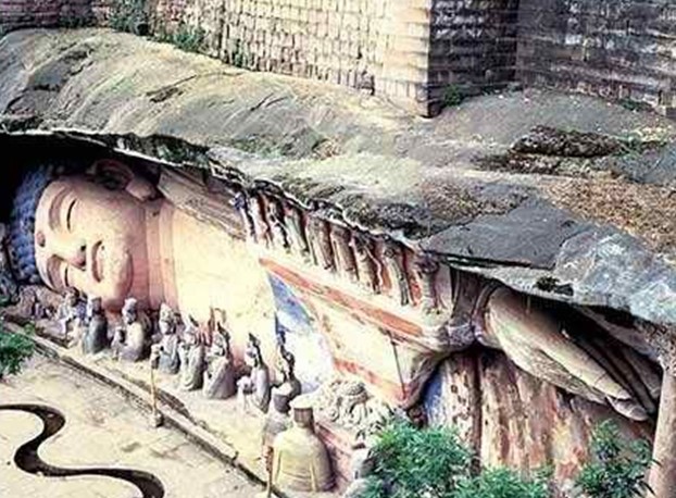 寶頂山造像以大佛灣為中心。大佛灣狀若馬蹄形.版權所有山東聊城聊之旅國際旅行社有限公司,轉載必究!全長500米。全部造像精心規劃,宛如一幅巨型畫卷。號稱“世界第四大臥佛”《釋迦涅磐圖》就在這里。這尊臥佛作半身處理,雙腳似乎伸進南巖中,使臥佛雖形半身,卻有全身之妙。這種意到筆不到的表現效果,正富于傳統藝術的含蓄美。有趣的是,臥佛頂的水池中,還刻有一雙兩公尺的足印,傳說這“是佛去西天留下的最后足印,亦是大足縣名之由來。