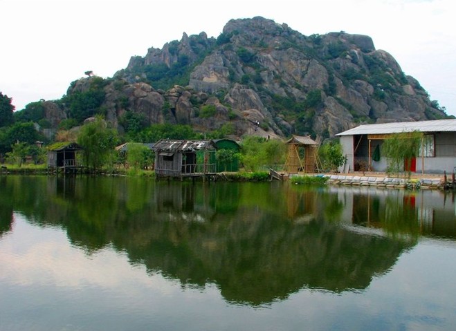 從梅林湖西登岸,經過石壁崖,游賞一線天,仰望“孫悟空”石,遙望豬頭洞,初入佳境。行行來到牛頭山,山脈從揭東縣伸入,以狀似牛頭得名。抬頭望,一巨石凌空聳立,這便是經常出現在《庵埠新聞》序景中的鐵砧石。這是一塊風蝕花崗巖,它上大下小,頂面略平,酷似打鐵的砧。這“鐵砧”頭重腳輕,一面又瀕臨峽谷,卻能穩立在另一塊巨石上,真是奇觀。