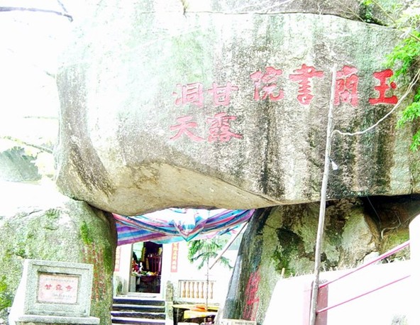 寺置身于天然石室之中,一塊700平方米的巨石凌空飛出,其平如削,其固如磐,蔚為奇觀(guān)。寺門(mén)由3塊巨石疊成品字型,門(mén)上“玉簡(jiǎn)書(shū)院”陳?ài)E尚存,“甘露洞天”勒石猶在。寺中有“天笠源流”、“萬(wàn)壽云宮”等摩崖石刻多處。