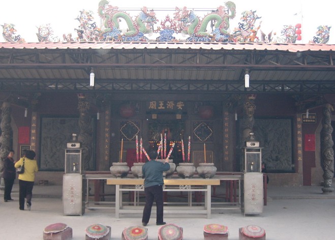 由于船和鳳凰塔都能在廟前看到,故人們印象深刻而傳誦一時(shí),此聯(lián)為惠來舉人卓晏春(1839至1890年)所撰。廟正門兩邊的旁門較小,門上石匾分別刻著“崇德”和“翼疆”,小門也有門聯(lián),但因沒有卓晏春撰的精采和實(shí)際而被遺忘了。廟內(nèi)的安濟(jì)圣王像披有黃色繡金線龍袍戴著皇冠,金身高達(dá)八尺,由堅(jiān)硬楠木刻成。但不是施所學(xué)從云南帶來的小神像,那小神像先前放在南門謝氏宗祠。據(jù)說至今保存完好。廟中圣王像要比兩邊的大夫人和二夫人像大得好多,以示威武神圣。