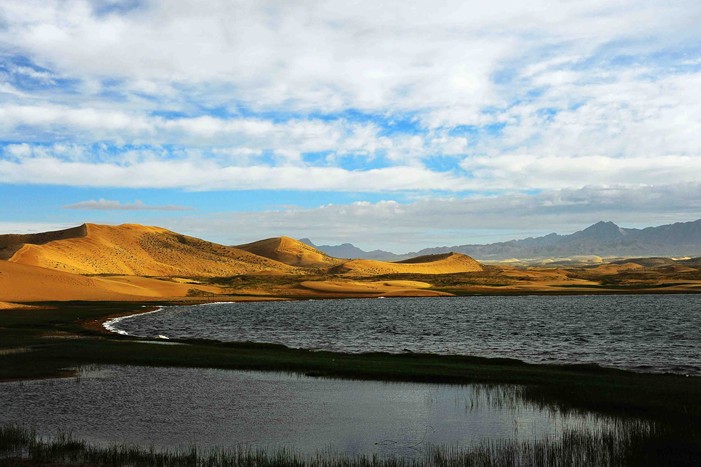 如今,相關部門在金子海開辟了旅游線路,讓游人滑沙、垂釣、戲水,觀賞高原荒漠的種種自然美景,在潔白蒙古包里品嘗奶茶、羊肉手抓,觀看蒙古族歌舞,了解和體驗民族風情,這些都會把游人帶人淳樸、自然之中。金子海,比月牙泉更美的沙漠清泉,不愿你成為樓蘭古國的遺憾。版權所有山東聊城聊之旅國際旅行社有限公司,轉載必究!也有傳說牦牛山上下來一對金羊,在湖邊飲水,嘗到水味香醇甘甜,就不愿再回山而進入湖中,故稱該湖為金子海。海的西側、西北側、東側都被沙山環抱,沙質是那般細膩,情不自禁讓人赤足,與其有更為親密的接觸。唯獨海的東南側是高高的蘆葦和近百米的草帶,吸引著鳥禽、牛羊覓食、嬉戲、休憩。水至清則無魚。由于金子海是由一眼甘甜的泉水日積月累而成,因此水極為清澈,淺水處不曾發現魚兒,版權所有山東聊城聊之旅國際旅行社有限公司,轉載必究!有的只是小海螺和小貝殼。其實,海的深處是有魚的。考古發現金子海的東邊是青銅器時代的文化堆積層,有石器和諾木洪文化夾砂褐陶罐殘片;說明,海的形成歷史悠久。在茫茫戈壁,有這樣一池甘甜的泉水養育著周圍的牧民,滋潤著這片土地上的一切生物,生生不息。