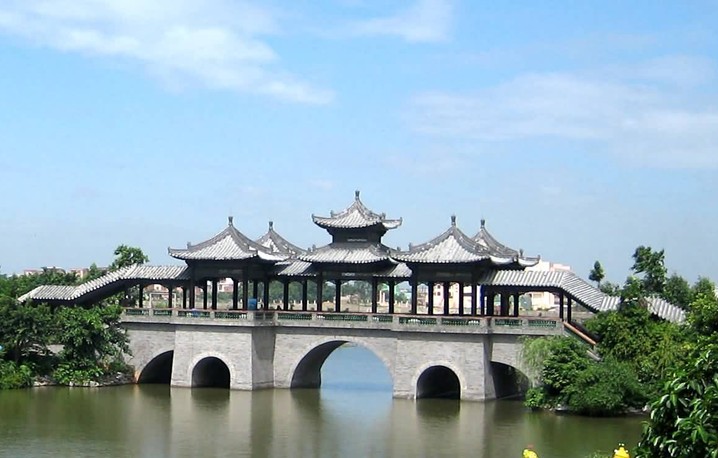 粵暉園歸水橋位于無香湖與映月湖交接的堤岸上,下設水閘,勢納東江,隨東江潮汐而變,換凈園水,永葆園內水質長清,故稱歸水橋。有詩為證:“橋自東江歸碧水,園從正道入青蚨”。歸水橋獨具嶺南特色,形象豐富。橋上架五亭如梅花布置,橋身用青石砌成,下由十二個大小不同的橋墩組成十五孔,平面呈“工”字形,兩側加階梯,橋面上矗立琉璃攢尖方亭五座,正中的主亭為重檐,其四角為單檐。每逢月滿,從正側橋孔觀望,每洞各映一月,金色晃動,眾月襯橋,使湖景更為美麗。歸水橋也是接通繞翠廊的關口,橋面相對前園高出3米多,這樣即使無香湖四周景觀高低起伏,又使繞翠廊有層次感,高低疊立,倚橋亭遠眺,視野開闊,園內美景盡收眼底。正是“水應園生,園因水活”。