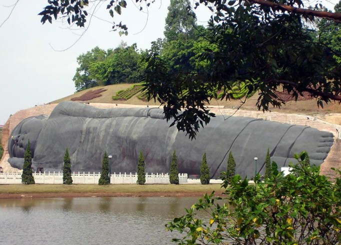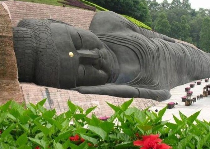 大臥佛位于森林公園天仙巖。相傳當年佛教大師六祖惠能傳教后深夜經過這里,看到天仙巖靈光閃爍,隱約可見這塊橫臥的大石塊就是一個大臥佛,六祖立即跪拜,求佛祖降福天下。大臥佛的雕造從這個傳說獲取靈感,以盛唐敦煌臥佛為范本,佛身長108米,尺度堪稱世界之最。現經改造用紫銅包裝大臥佛,成為金裝大臥佛。大佛前面是錦鯉池和荷花池,與大佛相互映襯引人入勝。大佛對岸一層為長六十米的長廊,廊內彩繪佛傳故事,二層為敬佛臺,憑欄對拜,大佛全景一覽無遺。