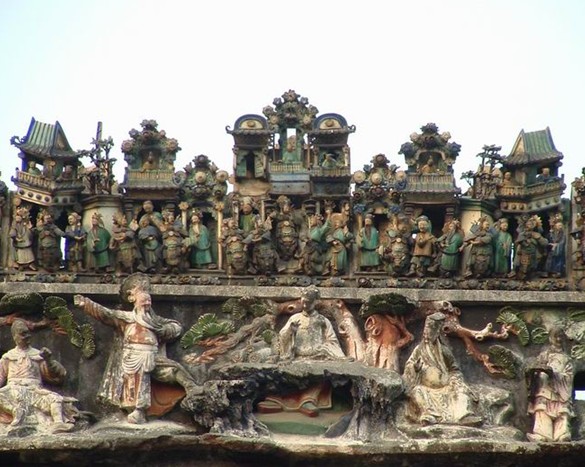 石灣陶塑脊飾。清代在南海、番禺、順德和香港、澳門等地的祠堂廟宇或富家豪宅中,正脊上大都用石灣燒制的陶塑脊飾。早期生產的脊飾,多用浮雕花卉圖案紋飾,隨著石灣陶塑的發展,浮雕花卉圖案紋飾逐漸轉變為歷史故事和民間傳說為題材的人物脊飾,這種石灣特有的陶塑脊飾文化,后來由廣東人帶往廣西、馬來西亞、新加坡等地。把自己家鄉的傳統文化傳往異國,這正上鄉土情懷的自然表現。