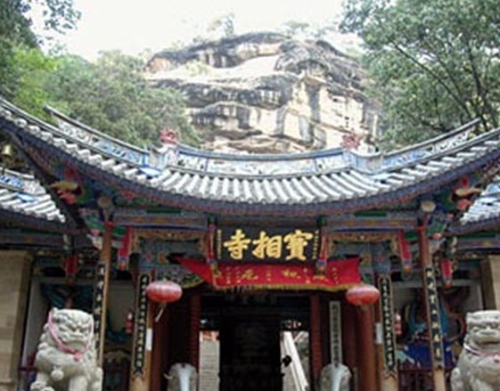 石窟道觀寶相寺,位于佛頂山上,依山建筑在一堵高聳險峻的大石崖上,下層是大殿,二殿為寺觀,鑿石抬梁,被譽為“云南的懸空寺”.