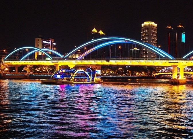 珠江包括東江、西江和北江等支流,匯合至廣州河段,景色十分秀麗。入夜,華燈璀璨,"珠江明珠"號(hào)旅游船搭載游客從人民橋附近西堤碼頭出發(fā),向東行駛,經(jīng)解放大橋、海珠橋。江灣大橋、海印大橋、廣州大橋、鶴洞大橋,而后回程。沿途景觀有珠海丹心、東湖春曉、黃埔云檣、鵝潭夜月等"羊城八景",還有南方大廈、愛(ài)群大廈、廣州賓館、華廈大酒店、江灣大酒店、二沙海珠廣場(chǎng)花園、白天鵝賓館,沙面洋房建筑等。全程兩個(gè)小時(shí)左右。