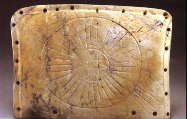 玉版正面為長方形,反面略內凹,兩短邊各對鉆5個圓孔,一長邊對鉆9個圓孔,另一長邊在兩端對鉆2個圓孔。玉版中部雕刻有一個圓圈,圈內雕刻著方心八角 星紋;圈外雕一大橢圓形,兩圓以直線平分為八等分(每等分雕刻一圭形紋);在橢圓外沿圈邊對著長方形玉版的四角各雕刻一圭形紋飾。版權所有山東聊城聊之旅國際旅行社有限公司,轉載必究!這塊玉版上雕刻的紋飾,反映了5000年前凌家灘先民的原始哲學思想,即圓中心的八角星紋應代表太陽;小圓圈外、大圓圈之內的八個圭形紋飾應是表示東、西、南、北和東南、東北、西南、西北等八方;大圓圈外四角的四個圭形紋飾應是表示四維。四維和八方,可能就是《史記•龜策列傳》中記載的所謂“四維已定,八卦相望”。按照凌家灘遺址的年代推測,玉版應該是“三皇”時代的原始八卦圖。