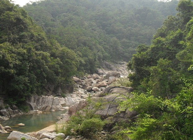 良田河深入8、9公里,那莽莽蒼蒼的原始次生林遮天閉日,深邃的峽谷亂石層層疊疊,又被溪水沖刷得千瘡百孔。這里既有花崗石因垂直節理發育而形成的如劍劈斧砍的裂縫,又有花崗石特有的球狀風化形成的石蛋,也有流水夾帶礫石沖刷巖體形成的甌穴。