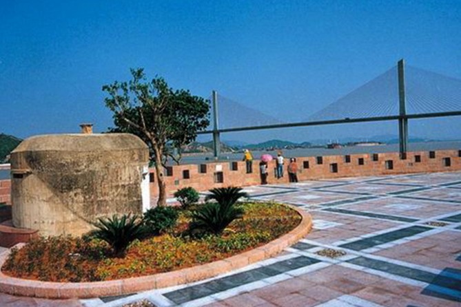 崖門古炮臺(tái)位于新會(huì)崖門出海水道東岸的古井鎮(zhèn)官?zèng)_村,最早設(shè)置于清康熙五十七年(1718年),并形成雛形,后于清嘉慶十四年(1809年)正式設(shè)立興建。崖門古炮臺(tái)雄踞新會(huì)崖山,倚山面海,緊緊扼守著珠江八大出海口之一——崖門通往南海的進(jìn)出水道。崖門大橋是跨越崖門水道的特大型雙塔單索面斜拉橋,全長(zhǎng)1289米,跨度668米,橋下可通航5萬(wàn)噸級(jí)船舶,跨度之大為目前國(guó)內(nèi)同類型橋梁之最,亞洲第一,世界第二。
