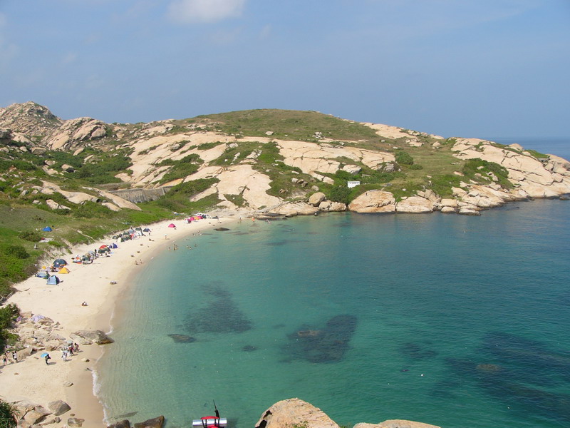 從外伶仃島開著“大飛”(400匹馬力的快艇)一直往南,掠過一大片滿滿漾漾顏色青蔥的海面,途中水面反射的純凈陽光讓人舍不得眨眼。就在你的眼睛快要變得和海水一樣晶瑩的時候,廟灣到1.46平方公里的一顆明珠,鑲在珠海的心口上。登上簡易碼頭,第一眼吸引你的,應該是對面那片名字叫做“下風灣”的沙灘吧?穿過零星的幾座簡易的水泥平房,依稀能聽見遠遠傳來的雞鳴犬吠。她就在你眼前了嗎?海水透明得讓人不敢逼視,珊瑚質的沙粒細嫩潔白得如有生命,礁石像水草般油油地在水底招搖……趕緊興沖沖地換上泳褲,慢慢走進,細沙調皮地撓著你的腳心,海水溫柔地把你纏繞——那是多么熨帖地包圍。