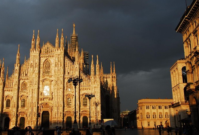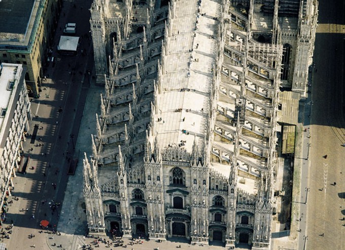米蘭大堂是世界上最大的哥特式建筑,有“米蘭的象征”之美稱。主教堂始建于1386年,由米蘭望族吉安?維斯孔蒂主持奠基。1500年完成拱頂,1774年中央塔上的鍍金圣母瑪麗亞雕像就位。1813年教堂的大部分建筑完工。1897年最后完工,歷時五個世紀。1805年拿破侖曾在米蘭大教堂舉行加冕儀式。至1965年教堂正面最后一座銅門被安裝,才算全部竣工。