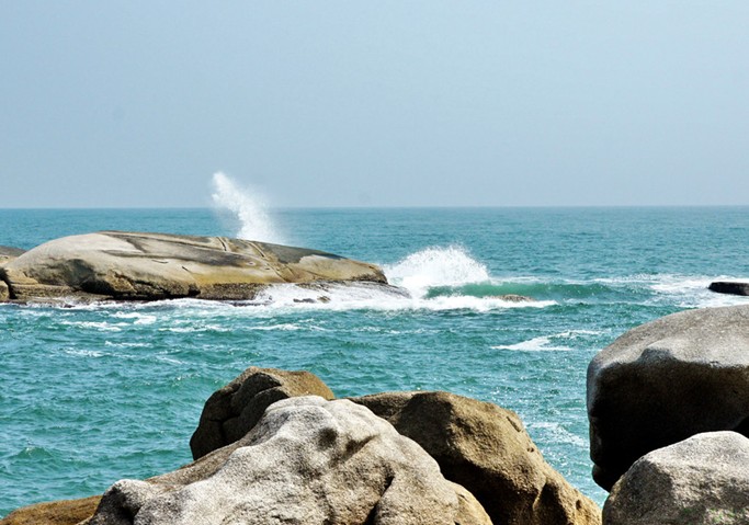 紅海灣的浪潮一浪接一浪,雪白浪花緊隨著潮頭,奔涌而來,又化成飛沫。的潮聲,構成了抒情的音樂。我們在沙灘奔走,盡情享受著這一切。轉過了一個半島。突然,浪潮不見了,潮聲消失了。大海就像一個溫柔的少女,在你身邊輕輕的歌唱。這就是真正的紅海灣,有兩副面孔,兩種情調,變化莫測,又風情萬種。遮浪半島突入海面,有如屏障似的擋住了東西兩面風浪,在半島兩側不管風向何方,景象迥然不同,當一邊波濤滾滾,巨浪排空,萬馬奔騰,另一邊則風平浪靜,一碧萬頃,波光粼粼,遮浪因而得名。