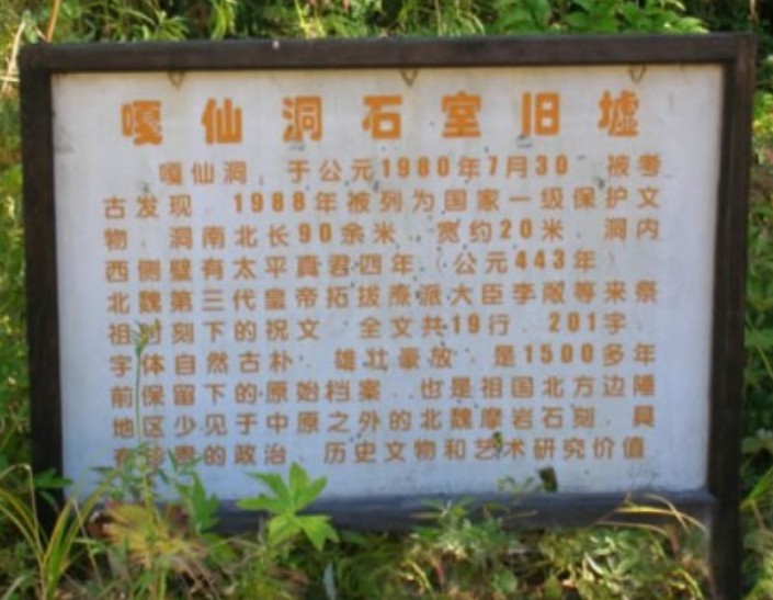1980年7月30日,人們?cè)诟孪啥磧?nèi)的斜陽(yáng)中發(fā)現(xiàn)壁上刻有一些道痕,剝掉笞衣,才發(fā)現(xiàn)北魏第三代皇帝拓跋燾派中書侍郎李敞,當(dāng)年祭祖時(shí)所刻的祝文。石刻祝文開頭一行有“維太平真君四年癸未七月甘五日”(公元443年)字樣。祝文通篇是歌祖先之功德,乞神靈之賜福。