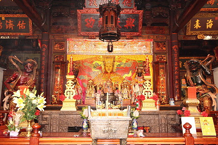 大天后宮為三進(jìn)門式。由大門朝里望,透過三進(jìn)逐次升高的天井和房舍狹長的空間,可以遙見那香煙繚繞、金黃帷幕下的全身媽祖神像。媽祖慈眉善目,神態(tài)安詳。據(jù)說媽祖原來是粉紅面,但經(jīng)百年來受香火的薰繞,現(xiàn)在看到的媽祖已成了黑色的“香煙面”了。兩旁配祀千里眼、順風(fēng)耳二將的泥雕,表情細(xì)膩,體態(tài)生動,古銅色的肌膚、一塊塊突起的肌肉,顯得極為兇猛威嚴(yán),雕刻精細(xì)入微,栩栩版權(quán)所有聊城聊之旅國際旅行社有限公司,轉(zhuǎn)載必究!如生,實(shí)為雕刻精品。兩邊的神龕里還供奉著東、西、南、北四海龍王和水仙尊王。神奇古怪,嶙峋不凡,也都被煙薰成了黑臉。這些都是與海上的航海、救難有關(guān)的神。該廟還有一個(gè)特色就是除了正殿的媽祖稱為大媽外,還配有所謂的“二媽”、“三媽”的媽祖神像,造型僅為大媽的一半,臉色為粉紅色,兩眼張開,與媽祖神像眼瞼呈下垂?fàn)畈煌?/p>