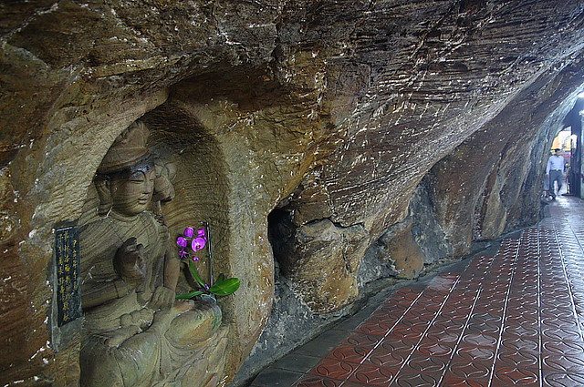 沿著石洞入內(nèi),燈光更為昏暗,但仔細看兩旁壁上,栩栩如生的石凋佛像,一尊尊的鑿壁而居,地藏菩薩、千手千眼觀世音菩薩、釋迦牟尼佛 ‥貧尊莊嚴(yán),更是引人入勝。