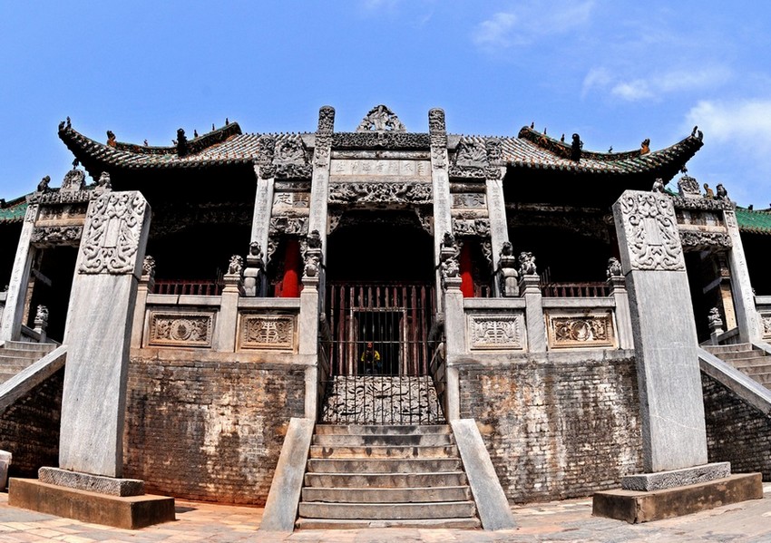 建筑群分前、中、后三進院落。位于中軸線上的建筑有:琉璃照壁、懸鑒樓、石牌坊、大拜殿、春秋樓。兩側相陪建筑有木旗桿、鐵旗桿、東西轅門、東西馬廄、鐘、鼓樓、東、西長廊、腰樓、藥王殿、馬王殿、道坊院等。其中春秋樓及其附屬建筑于咸豐七年為捻軍所焚,現存建筑152間。