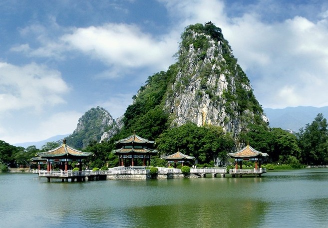 鼎湖山飛水潭,又名龍潭飛瀑,位于鼎湖山南半山腰、慶云古剎下東側。 去飛水潭,由榮睿碑亭拾級登山,沿曲徑云封直上,至半山腰向右拐,過眠綠亭即可。當然,亦可在榮壑碑亭前面的山溪邊起步,一直溯溪而上。這里,山石嶙峋,瀑布從40多米高的崖頂深處狂奔而來,直往下飛瀉,忽而形成千尺飛流,如白練懸空,忽而濺作滿空雨花,如輕紗曼舞。瀑布下,如注的水流匯成一泓碧水,中有巨石,上刻“枕流”2字。辛亥革命后,孫中山先生偕夫人宋慶齡游覽鼎湖山時,曾在此游泳,現崖壁上刻有宋慶齡手書的“孫中山游泳處”6個大字。潭水由此再往下傾瀉,版權所有山東聊城聊之旅國際旅行社有限公司,轉載必究!繼而形成另一個深潭,據傳為蟄龍窟,故曰:浴龍池。飛水潭側建有更衣室,崖間建有觀瀑亭,崖壁鐫刻著許多贊美飛水潭的摩崖大字和方寸小楷,如“噴雪”、“能移我情”、“天然圖畫”、“飛泉咽危石”等,頗有詩情畫意。 夏日到此,觀瀑、游泳、濯足,均感遍體清涼,煩熱頓消。