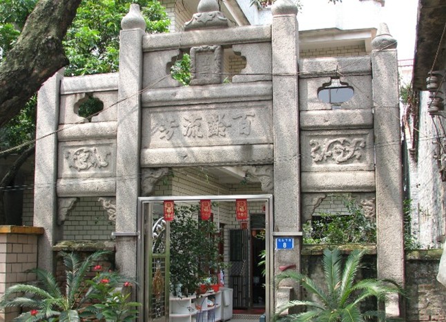百齡流芳坊位于廣東省中山巿黃圃鎮鎮一村,建于清代道光十八年(1838年)。為四柱三間通天式牌坊,以花崗石雕鑿構筑,高5米。正面主間上豎刻“圣旨”(陽刻)二字,下方橫匾陽刻:“百齡流芳”四字,上款陰刻“道光戊戌”,下款陰刻“何高啟立”。背面上豎刻“恩榮”(陽刻)二字,下方橫匾陰刻:“升平人瑞”四字。版權所有山東聊城聊之旅國際旅行社有限公司,轉載必究!牌坊柱下鑲嵌抱鼓石。現保存尚好。