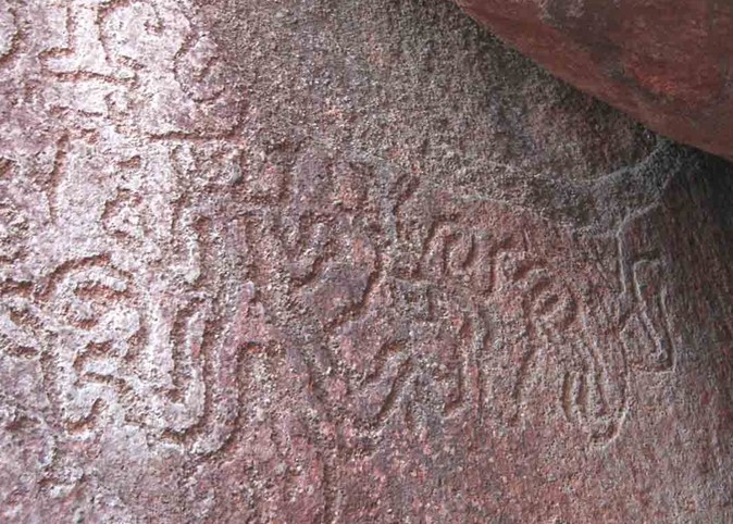 寶鏡灣摩崖石刻畫,位于廣東珠海市高欄島寶鏡灣,于1989年10月被發(fā)現(xiàn),共4處6幅,散布于海灣所在的山腰、山麓200米范圍內(nèi),其中最大的一幅長5米、高3米。巖畫陰刻于大塊平整的石面上,圖案密集而復雜,形狀有船、波浪、龍蛇、舞蹈人等,經(jīng)專家考證,是距今二三千年前青銅時代的產(chǎn)物,是南越先民生活的寫照。