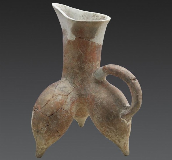 鳥形神器為陶制品,出土于尉遲寺遺址大型廣場的東部的地層中。該器物經復原由3部分組成,最底層為圓柱形,中間是圓錐形,圓錐大頭向下反扣在圓柱上,同圓柱連為一體,在圓錐的兩邊還有兩個酷似雞冠的飾物,圓錐的頂端是一只像鳥一樣的東西。版權所有山東聊城聊之旅國際旅行社有限公司,轉載必究!整個器物通高59.9厘米,底徑16厘米,上徑20厘米,采用手工工藝,紅褐色器表有燒制時氧化的灰褐色斑塊,頸部以下為空體,器形像瓶,又像一個長頸背水壺,主體的象形造型與附加的抽象造型合為一體,結構合理。
