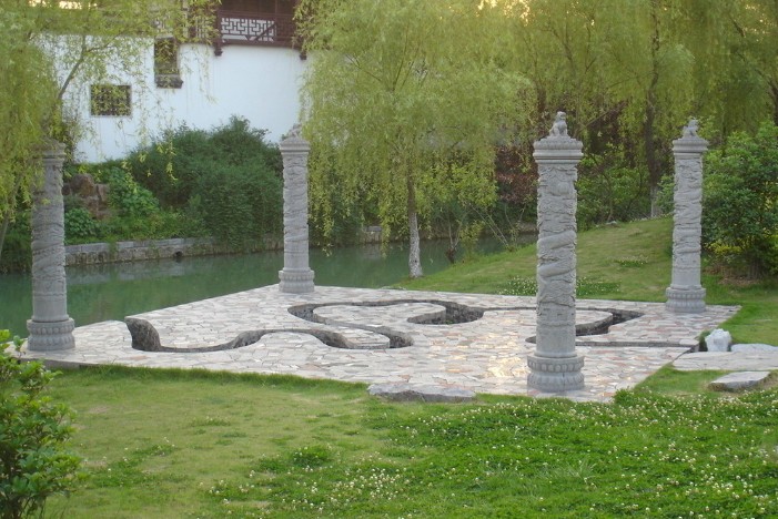 徽園大門的五根高32米的花冠狀球柱,象征著建國五十周年,全國人民在黨的領(lǐng)導(dǎo)下,在改革開放的浪潮中,取得豐碩成果,那五個(gè)大理石球,便是碩果累累之意。