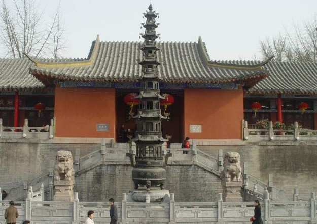 梁武帝時又在臺上建有鐵佛寺。唐大歷年間又重修擴建,定名明教院,至明代改為明教寺。后毀于戰火。明教寺,聳立臺上,雄偉壯觀,乃清光緒十一年太平天國遺老袁宏謨云游募化,按原樣重建而得。明教寺現為全國重點寺廟,由佛殿、藏經閣、西廂院三部分組成。殿分正殿和后殿,有佛像三十多尊。大雄寶殿飛檐翹角,風鈴叮鐺,殿脊高聳一巨大錫葫蘆,銀光閃耀,直刺云天,顯示了我國佛教寺院威嚴莊重得建筑特色。寺內鐘鼓齊鳴,梵音繚繞,充滿了神奇得宗教色彩。
