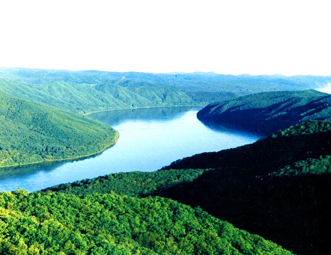 龍江三峽位于黑龍江蘿北段,三個美麗的峽谷分別是龍門峽、金龍峽和金滿峽,全長共62公里。乘著小艇逆江而上,江風夾著濕氣撲面而來,直鉆進人的毛孔里去。放眼望去,只見江水蜿蜒,江流湍急;兩岸山崖峻美,峰巒疊嶂。山環(huán)水抱,交相輝映,既有漓江的秀色,也有岷江的磅礴;既有長江三峽的雄奇,又有桂林山水的清雋;山青如繡,水綠如絹,江山如畫,濃彩重墨中透著淡雅,清新豪放中顯得莊重。