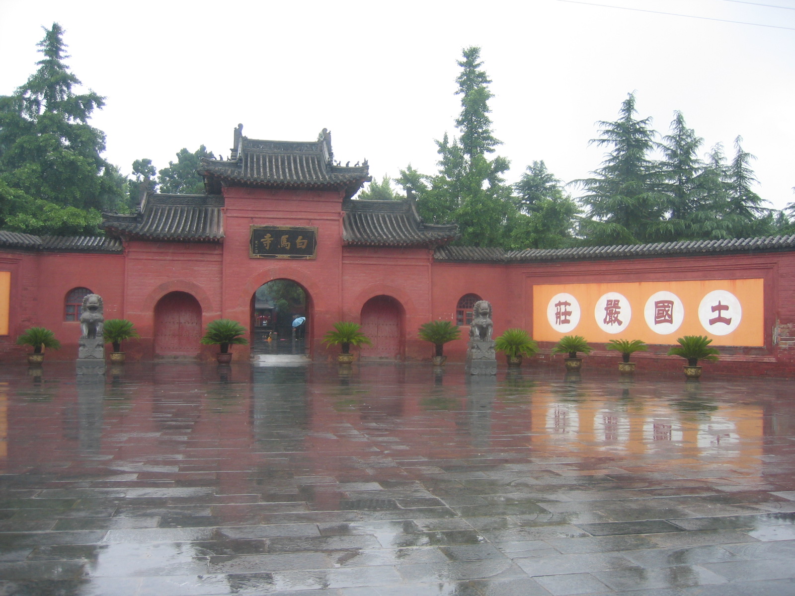 現存白馬寺坐北朝南,是一座長方形的院落,占地約4萬平方米。寺大門之外,廣場南有近年新建石牌坊、放生池、石拱橋,其左右兩側為綠地。左右相對有兩匹石馬,大小和真馬相當,形象溫和馴良,這是兩匹宋代的石雕馬,是優秀的石刻藝術品。白馬寺的山門為明代所重建,為一并排三座拱門,代表三解脫門,佛教稱之為涅盤門。部分門洞券面上刻有工匠姓名,皆為東漢遺物。寺內現存五層大殿,坐落在一條筆直的中軸線上,兩旁偏殿則互相對稱。天王殿,正中置木雕佛龕,龕頂和四周有50多條姿態各異的貼金雕龍。龕內供置彌勒佛,即“歡喜佛”。他笑口常開,赤腳趺坐,形象生動有趣,令人忍俊不禁。殿內兩側,坐著威風凜凜的四大天王,是佛門的守護神。彌勒佛像之后是韋馱天將,佛教的護法神,昂然佇立,顯示著佛法的威嚴。