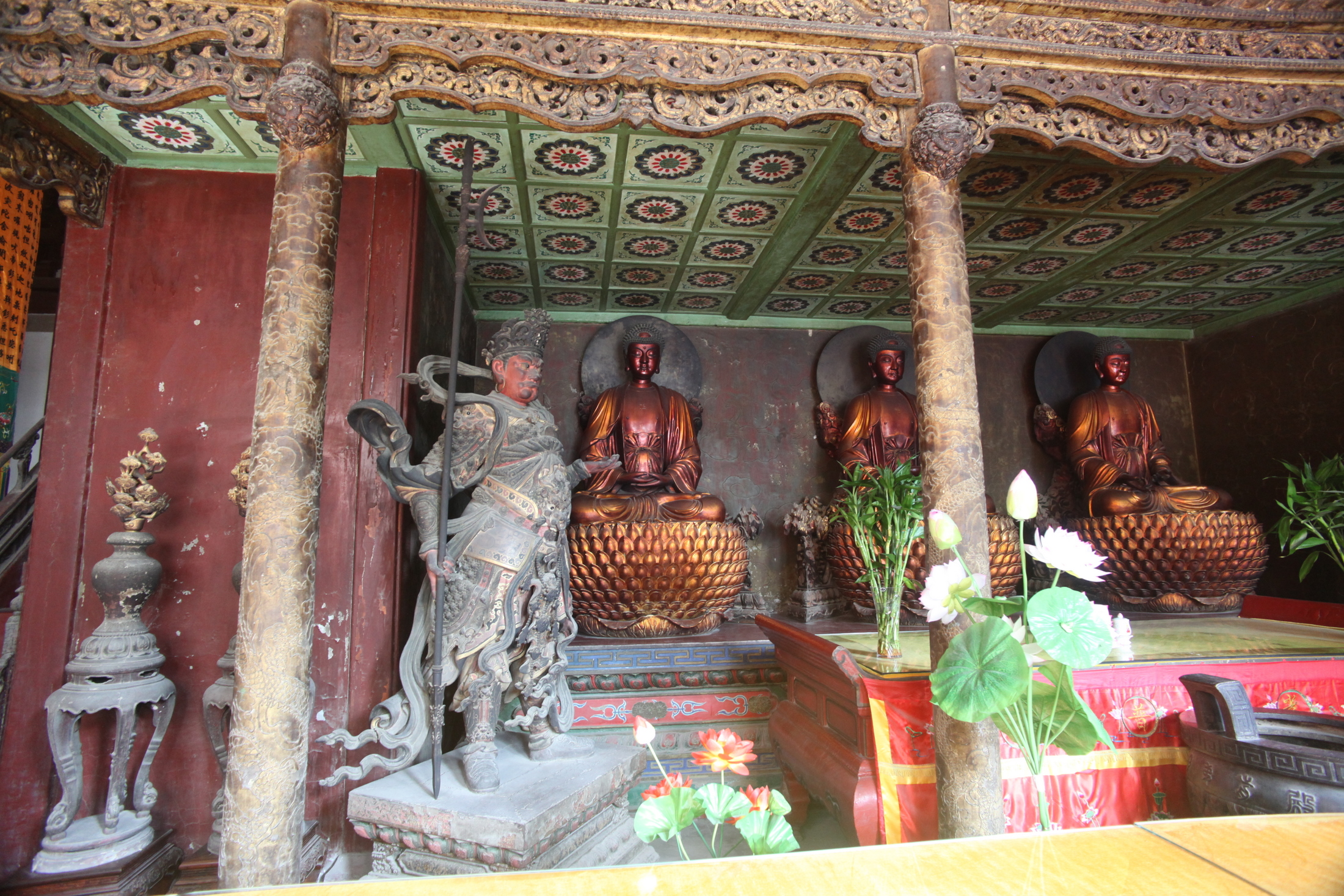 大佛殿之后,是一座懸山式建筑“大雄殿”。它長22.8米,寬14.2米。殿前有一月臺,是寺院內最大的殿宇。由歇山頂改為懸山頂,面積有所縮小。殿內貼金雕花的大佛龕內塑的是三世佛:中為婆娑世界的釋迦牟尼佛,左為東方凈琉璃世界的藥師佛,右為西方極樂世界的阿彌陀佛。三尊佛像前,站著韋馱、韋力兩位護法天將的塑像,執持法器。兩側排列十八尊神態各異、眉目俊朗的羅漢塑像。這十八羅漢都是用漆、麻、絲、綢在泥胎上層層裱裹,然后揭出泥胎, 制成塑像,這種“脫胎漆”工藝叫夾苧干漆工藝,在國內是獨一無二的,乃寺中塑像之精品,每座佛都是空心的,一只手即可托起。背后殿壁上還排列整齊地刻鏤著五千余尊微型佛像。