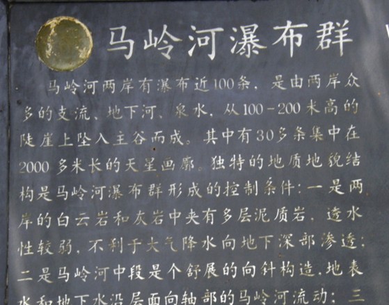 中國最大瀑布群,這里石峰成林,壯闊雄偉;峽谷成河,奇險幽深。它是國家最近公布的重點風景名勝區之一。馬嶺河發源于烏蒙山脈,流入黔、桂交界的南盤江,長達100多公里。它的地貌結構與一般峽谷不同,實際上是一條地縫。有人說:這是地球最美麗的傷疤。沿著石階下坡,奇險幽深的峽谷就逶迤展現在眼前。走在這條深200-400米的地縫底部,只見尖峭的峰巒赫然屏列,瀑布異彩紛呈且氣勢磅礴,有一種幽深的神秘氣氛彌漫在山谷間。