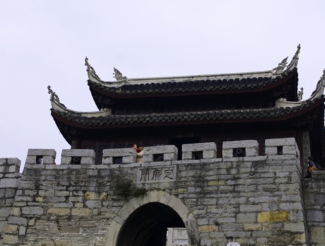 北城門又稱玄武門,為重檐歇山式頂木結(jié)構(gòu)建筑屋頂為青灰色瓦面,泥塑脊飾,是古代欽差下達(dá)皇帝圣旨的場所。初建于明朝天啟年(1621-1624),清順治十七年(1601年)班麟貴之子斑應(yīng)壽子承父職(土司)將土城墻改建為石城墻,清嘉慶三年(1798),武舉人袁大鵬重修擴(kuò)建,是青巖軍事古鎮(zhèn)的象征之一。