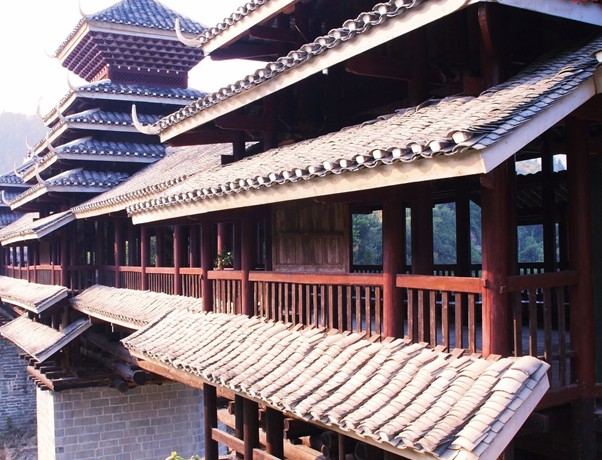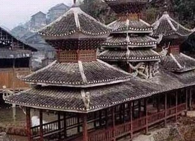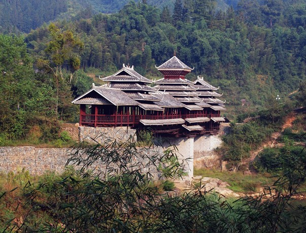 地坪風雨樓 這是貴州省最大、造型最美的風雨橋。長達50多米的地坪風雨橋始建于清光緒二十年即公元1894年,1959年毀于火災,1964年重建。整座橋不用一釘一鉚,而運用杠桿力學原理,將大小不一的柱、枋、檁、凳、欄桿等全部用杉木鑿榫穿枋構(gòu)成。橋體為長廊式木結(jié)構(gòu),橋上有一大兩小共三座橋樓。居中的大橋樓是鼓樓式建筑,兩邊的橋樓皆為三層重檐雙斜面屋頂。